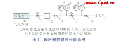 為了確保檢驗(yàn)過程的安全性,調(diào)壓器靜特性檢驗(yàn)的試驗(yàn)介質(zhì)采用壓縮空氣。調(diào)壓器靜特性檢驗(yàn)過程中,由調(diào)壓器1調(diào)節(jié)被測調(diào)壓器6的進(jìn)口壓力,由壓力變送器4測量被測調(diào)壓器6的進(jìn)口壓力值;通過手動(dòng)球閥9來調(diào)節(jié)通過被測調(diào)壓器6的壓縮空氣流量,流量值由流量計(jì)2測量,同時(shí)讀取由壓力變送器7測得的被測調(diào)壓器6實(shí)時(shí)的出口壓力值。在檢驗(yàn)過程中,進(jìn)口切斷閥3保持開啟狀態(tài),檢驗(yàn)結(jié)束后關(guān)閉進(jìn)口切斷閥3。如果在檢驗(yàn)過程中出現(xiàn)異常,則關(guān)閉進(jìn)口切斷閥3,故障排除后再開啟進(jìn)口切斷閥3繼續(xù)檢驗(yàn)。溫度變送器5和8測量被測調(diào)壓器6進(jìn)口和出口的壓縮空氣溫度。