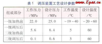 壓縮天然氣氣瓶車在母站充裝壓縮天然氣后通過公路運(yùn)輸進(jìn)入CNG儲(chǔ)配站,通過專用高壓軟管與卸氣柱相連,氣瓶車內(nèi)的壓縮天然氣經(jīng)調(diào)壓裝置調(diào)壓后送燃?xì)夤芫W(wǎng)供用戶使用。具體過程為:進(jìn)口壓力約22MPa的壓縮天然氣經(jīng)過裝置口高壓球閥、過濾器、緊急切斷閥后,在一級(jí)加熱裝置進(jìn)行加熱,加熱后的壓縮天然氣經(jīng)過一級(jí)調(diào)壓設(shè)備,壓力降為5.6MPa,然后進(jìn)入二級(jí)加熱裝置,加熱后的天然氣再經(jīng)過二級(jí)調(diào)壓設(shè)備,壓力降為0.1MPa,進(jìn)入城鎮(zhèn)中壓管網(wǎng)。調(diào)壓裝置工藝設(shè)計(jì)參數(shù)見表1。