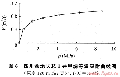 圖6為長芯1井120m處所取巖心的等溫吸附曲線(70℃等溫),該樣品為志留系龍馬溪組黑色頁巖,有機(jī)碳含量為5.9%,成熟度為3.26%。在70℃等溫條件下,隨著壓力增高,頁巖吸附甲烷的能力(V)逐漸增大,在壓力達(dá)到8.5MPa時,頁巖的甲烷吸附能力達(dá)到1m3/t。通過與美國5大頁巖氣盆地的頁巖等溫吸附曲線對比可以發(fā)現(xiàn),長芯1井志留系頁巖的吸附能力除與圣胡安盆地白堊系Lewis頁巖相近外,均低于其他盆地的頁巖。究其原因,筆者認(rèn)為很可能與成熟度有關(guān)。目前發(fā)現(xiàn)的進(jìn)行商業(yè)開發(fā)的美國5大頁巖氣盆地的頁巖,成熟度普遍不高,介于0.4%~1.9%之間。而熱成因的頁巖氣藏,頁巖成熟度較高,大多在1.1%以上,最高不超過3%。四川盆地長芯1井志留系頁巖的成熟度過高,Ro達(dá)到了3.26%,已進(jìn)入過成熟階段,這可能是導(dǎo)致其吸附能力較低的主要原因。另仔細(xì)分析可以發(fā)現(xiàn),美國5大頁巖氣盆地中圣胡安盆地白堊系Lewis頁巖的成熟度最高,為1.6%~1.88%,其頁巖的吸附能力則最小。