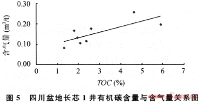 頁巖氣的勘探生產(chǎn)價值取決于其中游離氣和吸附氣的含量,游離氣的含量高低與其構(gòu)造保存條件密切相關(guān),而吸附氣含量受溫度、壓力等環(huán)境因素影響,在相同情況下,吸附氣量高低與有機(jī)質(zhì)含量呈正相關(guān)。上揚(yáng)子地區(qū)志留系烴源巖有機(jī)質(zhì)豐度高,預(yù)計將會在構(gòu)造保存條件差異較大的地區(qū)分別形成不同含氣量及含氣特點(diǎn)的頁巖氣聚集。在四川盆地,除已發(fā)現(xiàn)過去的老井在鉆探志留系頁巖段時具有豐富的氣顯示之外,目前完鉆的長芯1井初步分析結(jié)果顯示,在埋深淺于150 122龍馬溪組頁巖層段內(nèi),同樣發(fā)現(xiàn)了頁巖氣存在的證據(jù)(表2)。8個頁巖巖心的含氣量實(shí)驗(yàn)結(jié)果顯示(解析溫度70℃),每噸巖石含氣量為0.08~0.25m3,平均為0.15m3/t。另從110m和120m巖樣的甲烷碳同位素分別為-40.2‰和-52.3‰來看,頁巖氣應(yīng)為熱成因的天然氣。有機(jī)質(zhì)豐度與含氣量的關(guān)系則顯示(圖5),同美國頁巖一樣,同樣具有有機(jī)碳含量與含氣量呈正相關(guān)的關(guān)系,即有機(jī)質(zhì)豐度越高,含氣量越大。