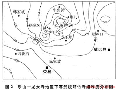 2) 下寒武統(tǒng)頁(yè)巖地層:分布面積大、范圍廣,可及整個(gè)揚(yáng)子地臺(tái)區(qū),現(xiàn)今殘留面積約90×104km2。烴源巖厚度50~500m,其中厚度大于50m以上烴源巖面積約58×104km2。發(fā)育的層位相當(dāng)穩(wěn)定,以下寒武統(tǒng)筇竹寺組為主,與之相當(dāng)?shù)倪€有川黔鄂地區(qū)的牛蹄塘組或水井沱組、蘇浙皖地區(qū)的荷塘組、冷泉王組等。巖性主要為暗色頁(yè)巖、黑色碳質(zhì)頁(yè)巖、碳硅質(zhì)頁(yè)巖、黑色粉砂質(zhì)頁(yè)巖。上揚(yáng)子地區(qū)的滇東、黔東北地區(qū)的頁(yè)巖地層普遍含磷,下?lián)P子地區(qū)夾石煤層。有機(jī)碳含量多在2.0%以上,最高可達(dá)13.64%,平均為2.77%。四川盆地下寒武統(tǒng)筇竹寺組井下樣品測(cè)試,有機(jī)碳含量平均為0.36%~5.03%,露頭樣品分析,有機(jī)碳含量平均為1.92%~2.35%(表3)。母質(zhì)類型以腐泥型干酪根為主,少量為腐殖型。干酪根δ13C為-29.82‰~-32.92‰(PDB),平均為-30.88‰,成烴潛力大。上揚(yáng)子與下?lián)P子地區(qū)頁(yè)巖演化程度較高,Ro一般大于3%,最高可至5%及以上;中揚(yáng)子地區(qū)頁(yè)巖的演化程度略低,Ro為2.0%~3.0%,部分還小于2.0%。目前在揚(yáng)子區(qū)已發(fā)現(xiàn)的古油藏,如貴州甕安古油藏、麻江古油藏、銅仁古油藏、浙江泰山古油藏、湘西南山坪古油藏、紹興坡塘古油藏等,油源均來自于下寒武統(tǒng)烴源巖。下寒武統(tǒng)烴源巖的分布范圍、厚度及有機(jī)碳含量在區(qū)域上基本穩(wěn)定,差異不大。上揚(yáng)子地區(qū)的四川盆地南部地區(qū)烴源巖厚度為200~400m,有機(jī)碳含量0.5%~5.00;至黔北、五陵、湘鄂西地區(qū)烴源巖厚度為50~500m,有機(jī)碳含量為0.5%~3.0%;江南隆起北緣生油區(qū)烴源巖厚度為200~400m,有機(jī)碳含量為0.5%~2%,至下?lián)P子地區(qū)西北部生油區(qū)烴源巖厚度是50~120m,有機(jī)碳含量為0.5%~5%;皖南、蘇南生油區(qū)烴源巖相對(duì)不發(fā)育,厚度在50m左右,有機(jī)碳含量為0.50~4%。下寒武統(tǒng)烴源巖生烴強(qiáng)度較高,部分地區(qū)為(100~200)×108m3/km2。四川盆地下寒武統(tǒng)筇竹寺組黑色頁(yè)巖厚74~400m,有機(jī)碳含量0.5%~4.1%,Ro為1.83%~3.26%。樂山-龍女寺地區(qū)下寒武統(tǒng)筇竹寺組發(fā)育最好(圖2),為一套淺水陸棚環(huán)境下沉積的黑色、深灰色頁(yè)巖,厚度一般為100~400m,資陽(yáng)-威遠(yuǎn)地區(qū)較厚,達(dá)250~350m,由古隆起頂部向南部坳陷區(qū)厚度大幅度增加。