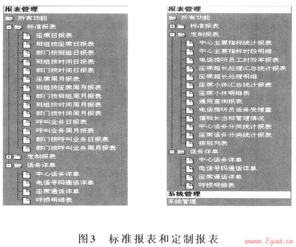 與服務(wù)熱線數(shù)字化管理的基本應(yīng)用工具比較,報(bào)表反映的內(nèi)容更全面更系統(tǒng)。尤其體現(xiàn)在熱線定制報(bào)表上。它把企業(yè)多年來在傳統(tǒng)數(shù)據(jù)統(tǒng)計(jì)匯總報(bào)表上積累的經(jīng)驗(yàn)作了優(yōu)化組合和集中提煉,針對(duì)性和效果都很好。圖3截取了報(bào)表管理系統(tǒng)中有關(guān)報(bào)表分類的樹狀結(jié)構(gòu)分布。