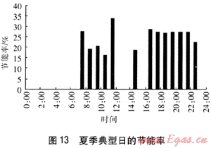 PEMFC建筑熱電聯(lián)供系統(tǒng)的節(jié)能率定義為滿足相同的電、熱水需求條件,PEMFC建筑熱電聯(lián)供系統(tǒng)比基準(zhǔn)方案節(jié)約燃料量與基準(zhǔn)方案消耗燃料最之比。PEMFC建筑熱電聯(lián)供系統(tǒng)在冬季工況和夏季工況的節(jié)能率見圖12、13。