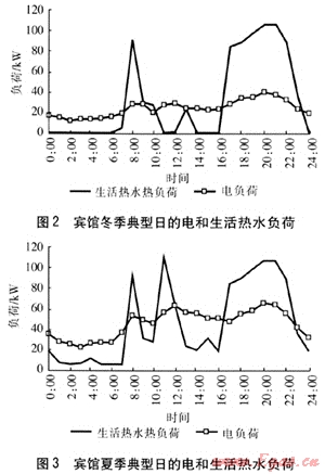 賓館的電負(fù)荷具有季節(jié)性特點(diǎn),夏季電負(fù)荷明顯高于冬季。賓館冬季典型日電負(fù)荷比較穩(wěn)定,晚間用電負(fù)荷明顯增加;由于使用空調(diào),夏季典型日電負(fù)荷比冬季增加近1倍。