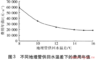 當(dāng)?shù)責(zé)嶝?fù)荷比例為80%、地埋管外徑為25mm時,對地埋管供回水溫差進(jìn)行優(yōu)化。不同地埋管供回水溫差下的費(fèi)用年值見圖3。由圖3可知,費(fèi)用年值在地埋管供回水溫差為15℃時最小。通過設(shè)計參數(shù)優(yōu)化設(shè)計可知,當(dāng)?shù)責(zé)嶝?fù)荷比例為80%、地埋管供回水溫差為15℃、地埋管外徑為25mm時,地?zé)崴疁厥夜嵯到y(tǒng)的經(jīng)濟(jì)性最好。
