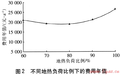 選取適中的地埋管回水溫度(30℃)、地埋管外徑(25mm),不同地?zé)嶝?fù)荷比例下的費(fèi)用年值見圖2。由圖2可知,采用適中的地?zé)嶝?fù)荷比例,可獲得較低的費(fèi)用年值。通過分析計算,不同供回水溫差、地埋管外徑下均存在類似的規(guī)律,因此可以確定地?zé)嶝?fù)荷比例為80%時,系統(tǒng)的經(jīng)濟(jì)性最好。