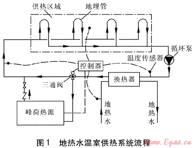 地?zé)崴疁厥夜嵯到y(tǒng)流程(見圖1)由換熱器、地埋管、峰荷熱源、循環(huán)泵、溫度傳感器、控制器、三通閥等組成。換熱器將地?zé)崴c供熱介質(zhì)隔開,防止地?zé)崴畬峁艿赖母g及結(jié)垢。地埋管安裝在溫室內(nèi)地面下,向溫室散熱??刂破髟诓杉覂?nèi)溫度、供熱介質(zhì)供回水溫度和地?zé)崴疁囟葦?shù)據(jù)的基礎(chǔ)上,進(jìn)行分析計算,控制三通閥的啟閉和峰荷熱源工作狀態(tài),調(diào)節(jié)補(bǔ)充熱量,滿足供熱要求。在設(shè)計地?zé)崴疁厥夜嵯到y(tǒng)時,需要掌握的地?zé)峋畢?shù)為:地?zé)崴疁囟?、水量、水位、水質(zhì)狀況。地?zé)崴疁囟取⑺靠梢源_定地?zé)崴淖畲蠊嶝?fù)荷,地?zé)崴挥糜跐撍玫倪x型,水質(zhì)狀況用來判斷地?zé)崴母g結(jié)垢趨勢。