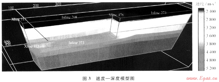 采用均方根速度轉換方法估算層速度與相干反演相結合的方法進行層速度模型的建立。通過疊前時間偏移迭代后,均方根速度模型比較準確,在一定程度上符合地質(zhì)變化規(guī)律。對于水平層狀或單傾的介質(zhì),均方根速度模型轉換的方法能得到較好的初始模型,并通過層析成像模型優(yōu)化能得到精確的速度模型。對于地層傾角變化較大、速度不均一的復雜斷塊,簡單的速度轉換方法不能合理地描述速度結構。采用相干反演法與均方根速度轉換法聯(lián)合建立層速度模型,相互驗證速度的合理性精度更高。通過分析沿層剩余速度,利用三維層析成像技術修改層速度模型優(yōu)化地質(zhì)模型,建立最優(yōu)速度-深度模型剛(圖3)。
