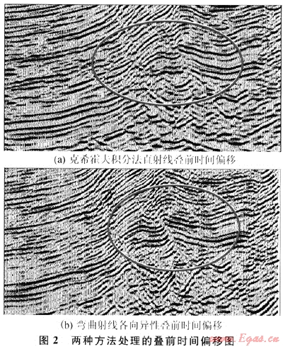 克?;舴蚍e分法疊前時間偏移,考慮了復雜陡傾界面的地層傾角及反射點彌散問題,能部分適應速度在縱橫向的變化[4]。由于沒有考慮射線彎曲,所以在速度縱向變化較時偏移效果不理想彎曲射線各向異性疊前時間偏移,由于它考慮了成像射線的彎曲及速度各向異性,更符合地下實際,成像效果明顯優(yōu)于直射線疊前時間偏移,在斷層成像、斷塊劃分能力以及目的層內(nèi)幕反射特征上有很大的改善(圖2)。