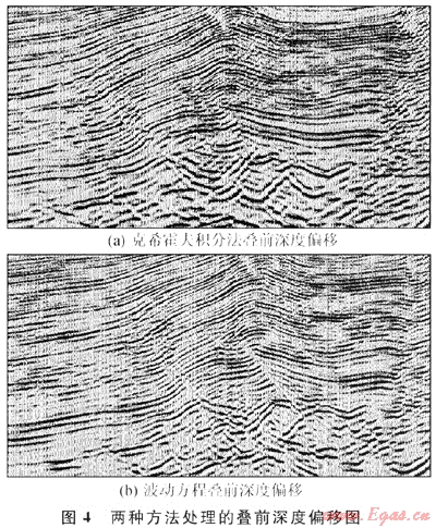 三維疊前深度偏移方法主要采用克希霍夫積分法,優(yōu)點是計算效率高,對野外觀測無任何限制適應能力強,且能較好的適應大傾角偏移,具有抗假頻能力;缺點是射線多路徑問題、焦散、振幅保真處理問題和分辨率低等。研究人員通過兩種途徑來解決不足:①對現(xiàn)有的克?;舴蚍ㄔ诼眯袝r計算和偏移方法方面進行改進,如從首波旅行時計算向基于波前重建的旅行時計算,其中考慮了多個射線,并且是利用體波旅行時、相對保幅處理和基于模型的孔經(jīng)定義等,改進后的成像結果其構造細節(jié)更加清楚可靠;②發(fā)展新的偏移方法,借助于高性能的PC-CLUSTER微機集群,采用波動方程偏移方法,其成像結果更好。圖4可看出波動方程疊前深度偏移在深層斷點歸位準確、振幅頻率保持較好,成像精度更高[6]。