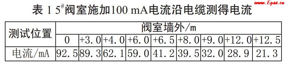 將RD8000的發(fā)射機正極連接陽極電纜,負(fù)極接地,調(diào)節(jié)適當(dāng)頻率。打開電源,輸出正常。打開接收機電源,調(diào)節(jié)頻率與接收機一致,查找電纜位置走向,同時測量電流大小。當(dāng)電纜上方前后電流大小有明顯變化時,初步判斷該處電纜斷點或虛接(表 1)。
