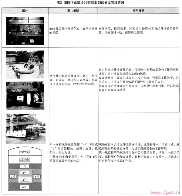燃?xì)馄髽I(yè)是沒(méi)有“圍墻的工廠”,存在很多臨時(shí)作業(yè)場(chǎng)所。如:井室搶維修作業(yè)、戶內(nèi)安檢作業(yè)等。相對(duì)來(lái)說(shuō)這些臨時(shí)性作業(yè)場(chǎng)所不穩(wěn)定因素較多,現(xiàn)場(chǎng)的安全控制更加重要。通過(guò)0HSAS18001我們可以識(shí)別了存在的風(fēng)險(xiǎn)、制定了安全措施和作業(yè)管理流程、以及應(yīng)急預(yù)案等,如果和5S現(xiàn)場(chǎng)定置管理結(jié)合起來(lái),可以取得更好的成效。見(jiàn)表3: