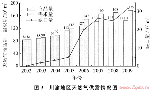 2002年,市場(chǎng)基本能維持平衡,但隨著天然氣市場(chǎng)的快速發(fā)展,各行業(yè)、各部門對(duì)其的需求量急速增長(zhǎng),導(dǎo)致市場(chǎng)供需缺口越來(lái)越大,市場(chǎng)平衡的任務(wù)愈加繁重。到2009年,市場(chǎng)缺口已經(jīng)高達(dá)30×108m3,如圖3所示。