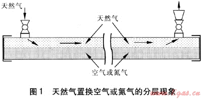 在置換過程中,將天然氣緩慢輸入到新建管道內(nèi),由于天然氣的密度小,相對密度一般為0.6左右,天然氣就會在管道的上部流動,而位于管道下部的空氣或氮氣就會滯留在管道內(nèi)。當檢測人員從出口取樣檢測時,儀器會顯示體積分數(shù)為100%的天然氣,如果此時停止置換,滯留在管道內(nèi)的空氣將與天然氣混合,非??赡苄纬杀ㄐ曰旌蠚怏w,在用戶使用時發(fā)生危險。這種情況會給安全運行帶來極大的隱患。