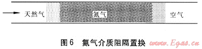 阻隔置換方法是近幾年在我國逐步推廣使用的,簡便易行、安全可靠。本文主要說明使用惰性氣體做中間介質(zhì)的置換方法,氮氣介質(zhì)阻隔置換見圖6。