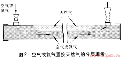 在氣體對氣體的置換過程中密度小的氣體(如天然氣)在密度大的氣體(如空氣、氮氣)的上方流動,或者密度大的氣體在密度小的氣體下流動時,容易出現(xiàn)兩種氣體分層流動的現(xiàn)象,稱之為分層現(xiàn)象[2]。天然氣置換空氣或氮氣的分層現(xiàn)象見圖1,空氣或氮氣置換天然氣的分層現(xiàn)象見圖2。