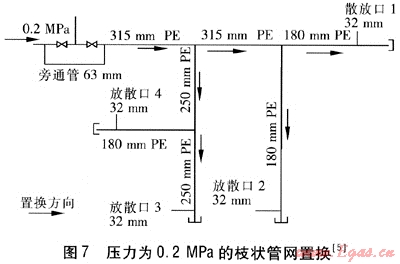 同時置換就是一個進氣口通入天然氣,所有支管上的放散口同時放散。這種方法要求較高,需要進行計算,必須保證所有支管的天然氣流速大于最小置換流速。而且此方法需要操作人員較多,控制復(fù)雜。此方法優(yōu)點是置換時間短,效率高,對周邊影響小。當所有支管的放散口取樣檢測的氧氣體積分數(shù)低于2%時,置換完成。注意,在置換過程中至少保持一個放散口始終打開,理論上要求最遠端的放散口在置換完成前一直打開。
