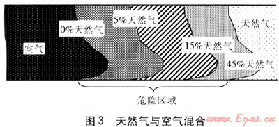 天然氣直接置換方法的特點是比較簡便也比較經(jīng)濟,但是具有一定的危險性。因為在置換過程中,管道里必然要產(chǎn)生天然氣與空氣的混合氣體,天然氣的前部氣體與空氣混合后,有一部分的混合氣在爆炸極限內(nèi),很容易在某外界因素的誘發(fā)下(如管道內(nèi)焊渣、金屬顆粒滾動等)產(chǎn)生爆炸,因此操作有嚴格的控制條件和要求,必須嚴格按規(guī)程實施,否則非??赡馨l(fā)生事故。對于天然氣來講,它的爆炸極限為5%~15%,再考慮到其混合的不均勻性,天然氣體積分數(shù)在45%以下均應(yīng)視為危險區(qū)(見圖3,圖中數(shù)據(jù)均為體積分數(shù)),遇火源就要發(fā)生爆炸。為此必須嚴格控制,采取各種安全措施,確保無火源。