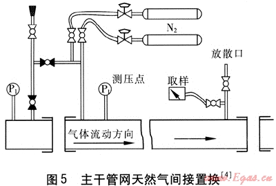 間接置換方法具體操作過程是先將惰性氣體注入管道,在管道末端放散,使用惰性氣體置換出空氣,直至放散管取樣口惰性氣體的體積分數(shù)達到預(yù)定的置換標準為止。在實際操作過程中一般用氧氣體積分數(shù)來衡量,如果連續(xù)2次取樣中的氧氣體積分數(shù)達到2%以下即為合格[1](在英國的置換要求中,此數(shù)據(jù)為連續(xù)2次測得取樣中的氧氣體積分數(shù)達到4%以下即為合格[2]),停止通入惰性氣體。然后再將天然氣通入管道,同樣操作,在檢測管的取樣口取樣,用高精度燃氣檢測儀進行實時的監(jiān)測分析,如果連續(xù)2次測得天然氣體積分數(shù)達到95%以上即為合格[1](在英國的置換要求中,此數(shù)據(jù)為連續(xù)2次測得天然氣體積分數(shù)達到90%以上即為合格[2]),置換完成。此法操作復(fù)雜、繁瑣,進行2次換氣,不僅耗用大量惰性氣體還耗用大量的燃氣,費用較高,并且換氣時間長,工作量大。但是,它可以確保進入管道內(nèi)的燃氣不會與管道內(nèi)空氣接觸,不會形成具有爆炸性的混合氣體。因此,此法可靠性好,安全系數(shù)高,成功率也高。主干管網(wǎng)天然氣間接置換見圖5[4]。