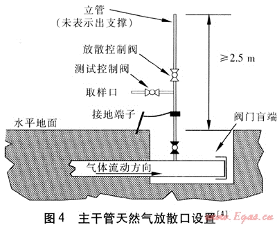 由于天然氣管道是封閉的,管道建成后經(jīng)歷了吹掃、強度試驗、嚴密性試驗等工序,管道內(nèi)沒有活動部件,不可能因運動、撞擊產(chǎn)生火花??赡艹霈F(xiàn)的火源有以下兩種:一是高速氣流會因摩擦產(chǎn)生靜電,所以置換時要對管道系統(tǒng)進行接地(見圖4[4]),即便有靜電負荷產(chǎn)生,也會立即通過接地裝置導(dǎo)入大地,不會有電荷積聚導(dǎo)致高電位而產(chǎn)生放電火花。二是高速氣流吹動管道中可能殘留下來的石塊、鐵屑、焊條頭等固體物質(zhì),與管道內(nèi)壁碰撞產(chǎn)生火花。引起此類事故的根本原因是高速氣流,解決的關(guān)鍵是確保氣流的低速,這樣即便有石塊等雜物,也不會被吹動,也就不可能產(chǎn)生火花。此外,為了避免將雜物帶進管道,應(yīng)事先在進氣管道上設(shè)置過濾器。根據(jù)英國相關(guān)資料及國內(nèi)應(yīng)用經(jīng)驗,我們將置換管道用天然氣的氣流速度控制在最小置換流速以上,一般最大流速控制在3m/s以下。在置換過程中采用流速計或U型壓力表觀察管道升壓速度的辦法來測量其充氣流速,用閥門的開度來控制流速(混氣過程中控制閥前的壓力要保持穩(wěn)定)。