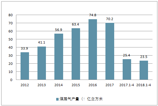 2017 年我國(guó)共實(shí)現(xiàn)煤層氣產(chǎn)量 70.2 億立方米, 2012-2017年年均復(fù)合增長(zhǎng)率為 15.7%,同時(shí)今年前四個(gè)月累計(jì)產(chǎn)量為 23.5 億立方米,同比增速為 8%(可能由于統(tǒng)計(jì)口徑問(wèn)題,實(shí)際數(shù)據(jù)較 2017 年略有下降)。