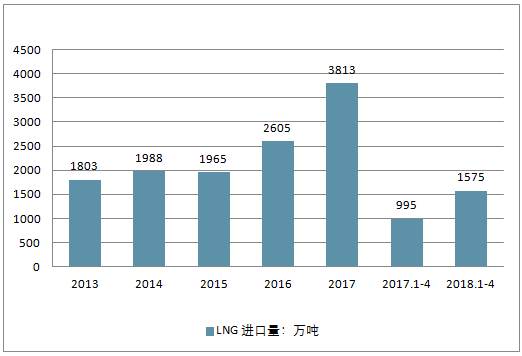 2017 年我國(guó)LNG 進(jìn)口主要包括澳大利亞、馬來(lái)西亞、卡塔爾、印度尼西亞,其中澳大利亞占到總量的 45%。近年來(lái),由于我國(guó)上游國(guó)產(chǎn)氣增量不足, 且進(jìn)口管道建設(shè)還需一定時(shí)間,因此LNG 進(jìn)口量近幾年大幅增長(zhǎng), 2013-2017 年年均復(fù)合增長(zhǎng)率達(dá)到 20.59%