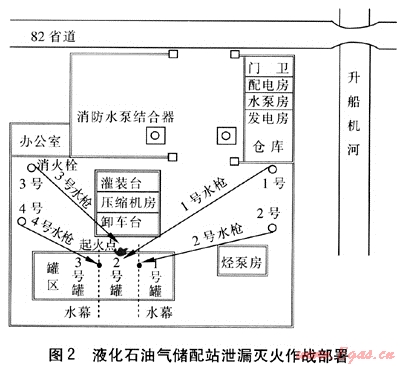 臺州市江北燃氣有限公司為臺州燃氣有限公司下屬子公司,其液化石油氣儲配站位于臺州市章安鎮(zhèn)華景村邊,儲配站東面為河道,南面西面為橘樹園,北面為82省道。站邊河道寬近20m,可作為消防水源。站內(nèi)有50m3臥式儲氣罐2臺、20m3臥式殘液罐1臺,采用地下儲罐形式,燃氣管道全部安裝在地面。為了增強公司員工應(yīng)對突發(fā)事故的應(yīng)急能力,也為了更好地充實、改進和完善公司的安全生產(chǎn)事故應(yīng)急救援機制和操作規(guī)程,每年經(jīng)常組織多種形式的消防滅火和液化石油氣泄漏搶險演練。