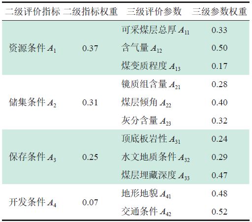 利用層次分析法對鎮(zhèn)威煤田各礦區(qū)中的煤層氣選區(qū)的關(guān)鍵要素進(jìn)行定量排序, 將研究區(qū)煤層氣資源、儲集條件、保存條件和煤層氣開發(fā)基礎(chǔ)條件作為4 個二級評價(jià)指標(biāo),每個二級評價(jià)指標(biāo)對于煤層氣開發(fā)的影響又受多個三級參數(shù)的影響,包括可采煤層總厚、含氣量、資源豐度、揮發(fā)分含量、鏡質(zhì)組含量、煤層穩(wěn)定性、灰分含量、頂?shù)装鍘r性、水文地質(zhì)條件、煤層埋藏深度、地形地貌及交通條件(表3)。