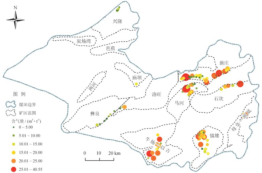 鎮(zhèn)威煤田煤層含氣量橫向上總體表現(xiàn)為東高西低的特征,彝良和廟壩礦區(qū)含氣量較低,一般不超過15 m3/t ;新莊礦區(qū)西部、馬河礦區(qū)、牛場—以古礦區(qū)和鎮(zhèn)雄礦區(qū)西北部煤層含氣量較高,一般介于9 ~ 18m3/t ;東部石坎礦區(qū)、母享—則底礦區(qū)及新莊礦區(qū)東部含氣量變化較大,一般介于5 ~ 20 m3/t,最大含氣量可達(dá)40 m3/t(圖3)。