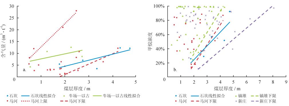 含氣量與煤厚大體上呈正相關(guān)關(guān)系,部分礦區(qū)含氣量與煤厚呈較明顯的線性正相關(guān)關(guān)系,如石坎礦區(qū)(相關(guān)系數(shù)R 為0.6)。較常見的情況是含氣量與煤層厚度之間存在一定的離散性,但其中煤層厚度與含氣量上限及含氣量下限同時(shí)存在較明顯的線性關(guān)系,如馬河礦區(qū)(圖5-a)。甲烷濃度的下限與煤厚普遍表現(xiàn)為正相關(guān)關(guān)系,反映煤層厚度的增加有助于煤層氣的保存(圖5-b)??傊?,煤層厚度不僅控制了煤儲層的生氣潛力,對煤層氣保存也有一定影響,在煤層頂?shù)装灞4鏃l件不理想的情況下,煤層厚度對含氣量的影響更為顯著。