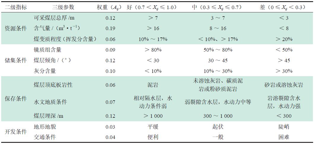 表3 鎮(zhèn)威煤田煤層氣選區(qū)評價(jià)參數(shù)及權(quán)重參數(shù)表