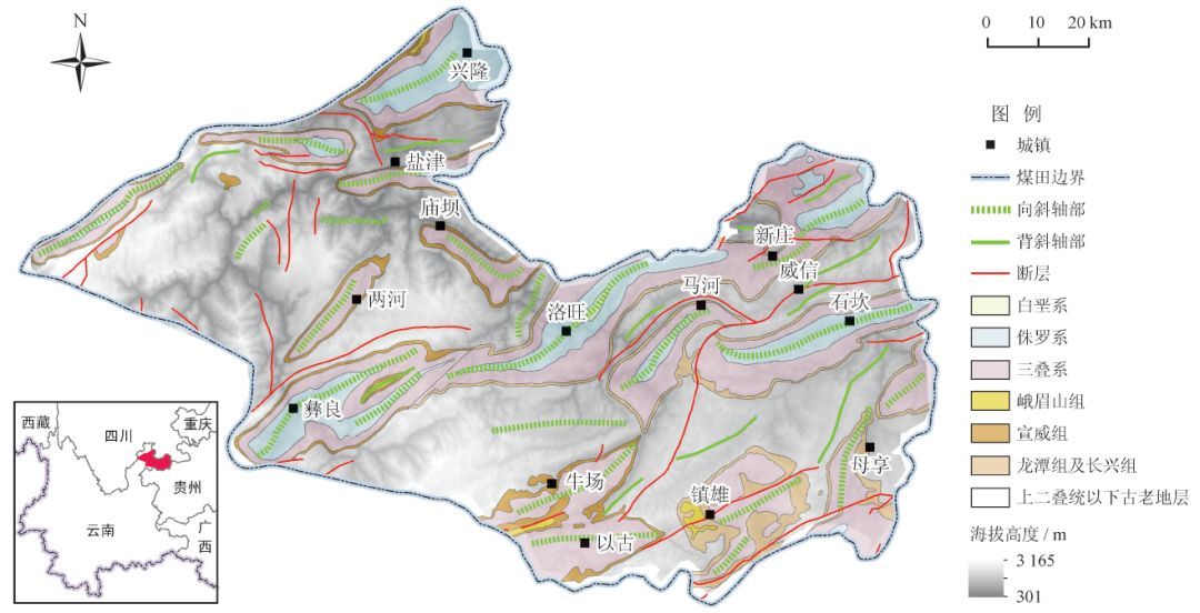 圖1 滇東北鎮(zhèn)威煤田區(qū)域位置及地質(zhì)概況圖