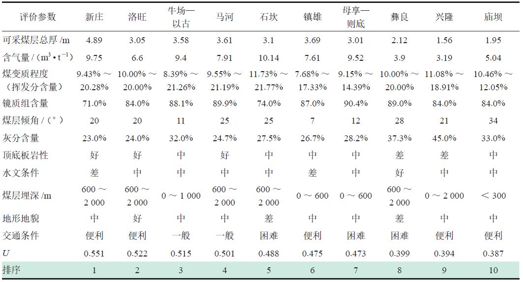 根據(jù)表4 建立的評價(jià)參數(shù)權(quán)重體系對鎮(zhèn)威煤田中新莊、石坎、母享—則底、鎮(zhèn)雄等10 個礦區(qū)的煤層氣勘探潛力指數(shù)U 進(jìn)行計(jì)算,結(jié)果表明有4 個礦區(qū)具有較好的勘探潛力(U > 0.5),其中新莊礦區(qū)煤層氣開發(fā)潛力最好,其次為洛旺礦區(qū)、牛場—以古礦區(qū)和馬河礦區(qū),其他礦區(qū)開發(fā)潛力相對較差,如表5 所示。