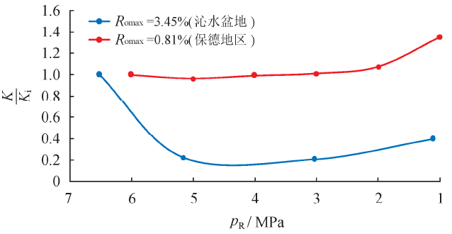 注:K 表示地層壓力下煤巖滲透率;Ki 表示初始地層壓力下煤巖滲透率;pR 表示地層壓力