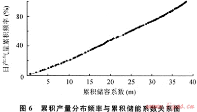 由圖6可以看出:日產(chǎn)氣量與累計儲容系數(shù)相關(guān)性很好。表明分層產(chǎn)量除受地層系數(shù)影響外,還與儲容系數(shù)有關(guān),即高滲層的儲量決定了氣井的產(chǎn)量水平和穩(wěn)產(chǎn)能力。綜合分析認(rèn)為,四-1單元高滲層中儲量所占比例較少,不能滿足目前氣井配產(chǎn)的穩(wěn)產(chǎn)需求,由此表現(xiàn)出氣井產(chǎn)量遞減。