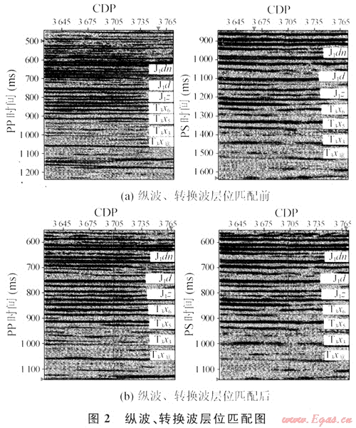 在井旁標(biāo)定層位后,就可以展開整個剖面的對比工作,這與常規(guī)解釋相同。層位解釋完成后,需要做多波解釋的特殊解釋工作——層位匹配。由于縱波、橫波在同一地層介質(zhì)中的傳播速度不同,因此同一反射在時間剖面上縱波和轉(zhuǎn)換波的時間有很大差異,為了更好對縱波、轉(zhuǎn)換波進行聯(lián)合地質(zhì)目標(biāo)體解釋,須對縱波橫波進行層位匹配。層位匹配是對縱、橫波地震響應(yīng)較為系統(tǒng)的一個認識過程。圖2是縱波、轉(zhuǎn)換波層位匹配前后的時間剖面,可以看出,經(jīng)匹配后縱波、轉(zhuǎn)換波層位得以一一對應(yīng)。