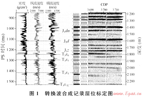 多波解釋首當(dāng)其沖的問題便是轉(zhuǎn)換波的地質(zhì)層位標(biāo)定。它是多分量解釋最為關(guān)鍵的一環(huán),也是國內(nèi)外公認的一個難點。圖1是利用GeoMountain解釋工程師軟件在縱波地質(zhì)層位標(biāo)定的基礎(chǔ)上對GA2井進行轉(zhuǎn)換波合成記錄地質(zhì)層位的標(biāo)定結(jié)果。