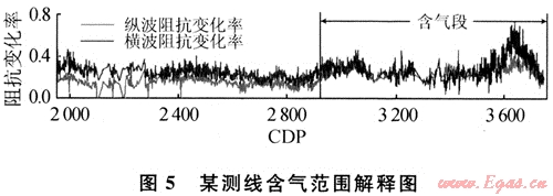 通過匹配的PP波和PS波剖面就得到了目的層段的PP波和PS波旅行時的對應(yīng)關(guān)系,這是進行多波聯(lián)合反演的重要基礎(chǔ)。完成多波層位匹配方可進行多波聯(lián)合反演。多波聯(lián)合反演采用目的層位的PP波和PS波AVO效應(yīng)來求取目的層位的彈性參數(shù)信息。因此首先拾取出目的層的AVO曲線(圖4)。為了將AVO曲線轉(zhuǎn)換為AVA曲線,利用PP波和PS波速度譜建立PP波和PS波的速度場,對速度比進行估計。經(jīng)AVO正演方法對地震數(shù)據(jù)能量進行調(diào)整,最后由目的層頂界面PP波和PS波的AVO曲線反演了蓋層與儲層的縱波和橫波的阻抗變化率(圖5)。綜合工區(qū)井資料、地質(zhì)資料進行分析,再由橫向上的阻抗變化率圖可見,在CDP2890附近特征明顯變化,左邊的阻抗變化率低于右邊的,但提高變化率較為明顯反映了目標(biāo)儲層的含氣范圍,為此套儲層的開發(fā)提供了依據(jù)。