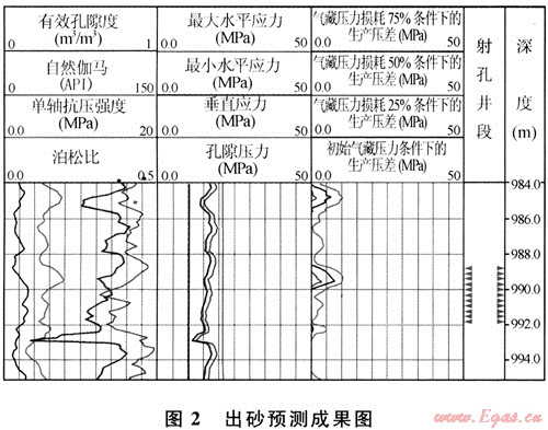 圖2中,988.7~992.0m井段為射孔層位。處理結(jié)果表明,在初始?xì)獠貕毫l件下,地層臨界出砂的生產(chǎn)壓差為1~10MPa;如果氣藏壓力下降25%(見氣藏壓力損耗25%條件下的生產(chǎn)曲線),那么,該射孔層位下部會(huì)出砂。