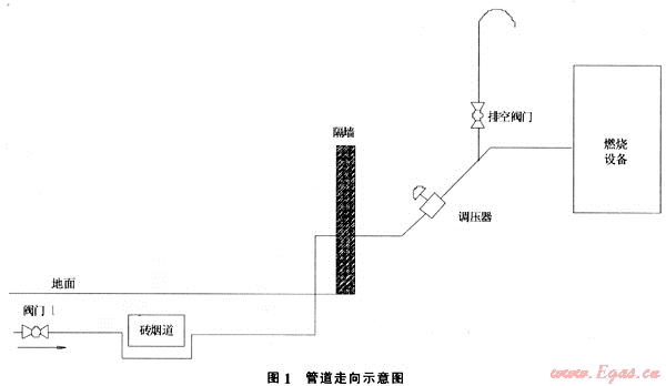 管道概況:新建管道長(zhǎng)約200m,設(shè)計(jì)壓力為0.4MPa。從一支線閥門(mén)井用de110的PE管道接出后埋地鋪設(shè),途中從一地下磚制煙道下方下翻穿越,之后穿出地面改為DN100鋼制管道進(jìn)入車(chē)間,經(jīng)調(diào)壓、計(jì)量后接入燃燒設(shè)備(圖1)。管道建成后經(jīng)過(guò)空氣強(qiáng)度和氣密性試驗(yàn)合格。