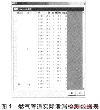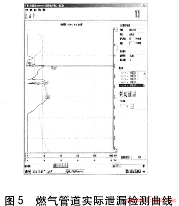 2004年元月2日,對呼和浩特市新建西街的燃?xì)夤芫W(wǎng)進(jìn)行檢漏,當(dāng)車行駛在新建西街上,報警聲響起,電腦屏幕立即顯示,發(fā)現(xiàn)了有燃?xì)庑孤┑牡胤?。圖4是燃?xì)夤艿缹嶋H泄漏檢測數(shù)據(jù)表。為了真實還原這次燃?xì)庑孤z查的全過程,從實際記錄的預(yù)覽檢測圖中,可以看到該次檢測的檢測結(jié)果和其他信息。圖5是燃?xì)夤艿缹嶋H泄漏檢測曲線。