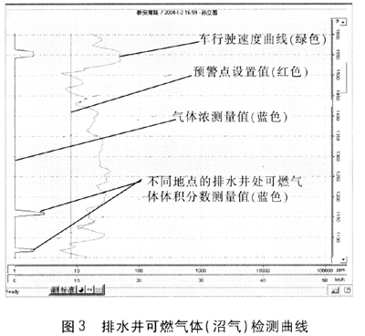 采用車載FID檢測系統(tǒng)對排水井可燃?xì)怏w(沼氣)檢測曲線見圖3。
