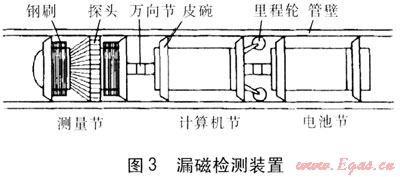 漏磁檢測(cè)裝置由釹鐵硼永久磁鐵勵(lì)磁,采用霍爾效應(yīng)傳感器檢測(cè)磁場(chǎng)。該裝置自帶電源,隨傳輸介質(zhì)運(yùn)行,數(shù)據(jù)存儲(chǔ)在硬盤中。完成檢測(cè)后,經(jīng)評(píng)價(jià)軟件處理得到缺陷尺寸及所在位置,為管道安全評(píng)價(jià)、壽命預(yù)測(cè)、管道維護(hù)提供技術(shù)支持。為保證裝置順利通過(guò)彎頭,裝置分為測(cè)量節(jié)、計(jì)算機(jī)節(jié)和電池節(jié)3節(jié),節(jié)間采用軟連接,漏磁檢測(cè)裝置見(jiàn)圖3。