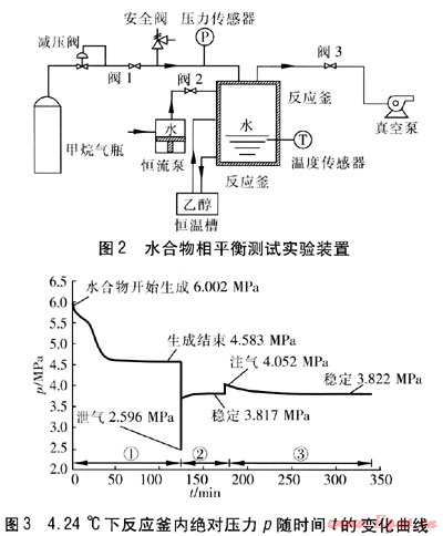 水合物相平衡測試實(shí)驗(yàn)裝置見圖2。實(shí)驗(yàn)氣體為純CH4,反應(yīng)釜內(nèi)初始絕對(duì)壓力為6MPa,恒溫槽溫度為(4.24±0.05)℃,去離子水體積為80mL。實(shí)驗(yàn)操作步驟及現(xiàn)象如下: