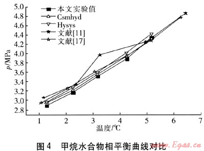 由表2可以看出,本文實(shí)驗(yàn)數(shù)據(jù)與軟件計(jì)算值的最大偏差為3.49%。實(shí)驗(yàn)所得的結(jié)果與Csmhyd軟件及Hysys軟件計(jì)算值有很好的一致性,這一點(diǎn)證實(shí)了實(shí)驗(yàn)的可靠性。
