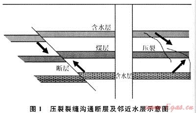 由于煤巖非均質(zhì)性強,微孔隙、微裂縫發(fā)育,且斷裂韌性比常規(guī)砂巖、泥巖低,在水力壓裂施工過程中裂縫擴展不完全受地應力方位控制,還受濾失高的主天然裂縫控制。部分井在壓裂施工過程中,煤層破碎明顯,隨著裂縫的延伸,壓穿了上下砂巖層或連通了斷層,從而溝通了鄰近水層(圖1),在排采過程中產(chǎn)水量大,排水降壓困難,產(chǎn)氣量低或完全不產(chǎn)氣[11]。