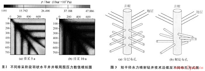 短半徑水力噴射鉆井技術(shù),其特點是可以實現(xiàn)在0.12m直徑的立井井段中完成從垂直轉(zhuǎn)向水平,并可以沿不同方位對煤層鉆水平孔眼開采煤層氣(圖3)。與常規(guī)直井水力壓裂相比,短半徑水力噴射鉆井具備定向效果好、穿透深度長等一系列技術(shù)優(yōu)勢[12~13]:①水力噴射可以沿井筒任意方位進行,從而可根據(jù)煤儲層應力分布情況,使水平孔眼最大限度地溝通煤層天然裂縫,提高裂縫的導流能力;②能根據(jù)需求在煤層中沿不同方位鉆出120m以上的長直孔,從而可以增大井眼與煤儲層接觸面積,擴大煤層氣井的降壓解吸范圍;③煤層鉆孔后,孔眼周圍煤儲層應力降低,形成新的微裂紋,從而可以提高水平孔眼周圍煤儲層透率;④水平孔眼可采取分層布孔或螺旋布孔,通過優(yōu)化孔眼結(jié)構(gòu)、充分利用孔眼間相互干擾作用可加快區(qū)域煤層氣降壓解吸,提高煤層氣井單井產(chǎn)量。