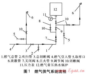燃?xì)夤庀到y(tǒng)流程見圖1。燃?xì)夤艿涝谕V惯\(yùn)行進(jìn)行檢修時(shí),為檢修工作安全,需要管道內(nèi)的燃?xì)獯祾吒蓛?。系統(tǒng)在較長(zhǎng)時(shí)間停止工作后再投入運(yùn)行前,也需要進(jìn)行吹掃。因此,在鍋爐房供氣系統(tǒng)設(shè)計(jì)中,應(yīng)設(shè)置吹掃和放散管道。放散管出口應(yīng)高出屋脊2m以上。由鍋爐房外部引入的燃?xì)饪偣?,在進(jìn)口處應(yīng)裝設(shè)燃?xì)饪偳袛嚅y,按燃?xì)饬鲃?dòng)的方向,閥前應(yīng)裝放散管,并在放散管上裝設(shè)取樣口,閥后應(yīng)裝吹掃管。為保證鍋爐安全可靠運(yùn)行,要求供氣管和其他管道上安裝的附件連接嚴(yán)密可靠,能承受最高使用壓力,且不得裝設(shè)在高溫和有危險(xiǎn)的地方[3、4]。