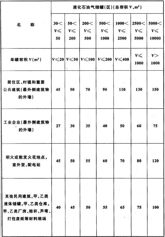 4.4.1 液化石油氣供應(yīng)基地的全壓式和半冷凍式儲罐(區(qū)),與明火或散發(fā)火花地點(diǎn)和基地外建筑等的防火間距不應(yīng)小于表4.4.1的規(guī)定,與表4.4.1未規(guī)定的其他建筑的防火間距應(yīng)符合現(xiàn)行國家標(biāo)準(zhǔn)《城鎮(zhèn)燃?xì)庠O(shè)計(jì)規(guī)范》GB 50028的規(guī)定。