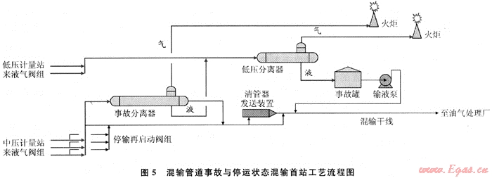 5) 在混輸首站,采用可隨時快速將油井產(chǎn)物的中壓氣液混輸流程轉(zhuǎn)換為中、低壓二級氣液分離流程的事故分離器過流運(yùn)行工藝,其工藝流程詳見圖4、5。